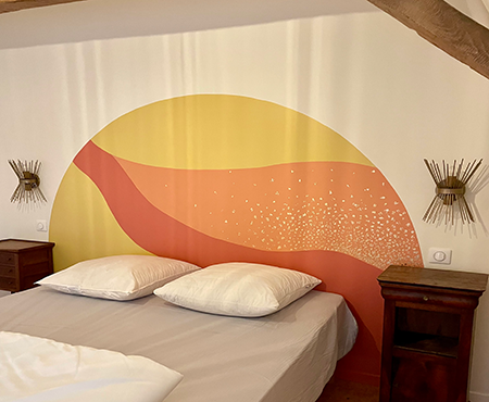 Réalisation d’une décoration murale sur mesure pour la tête de lit dans une chambre au thème soleil. Une création artisanale peinte à la main pour un univers chaleureux et personnalisé.